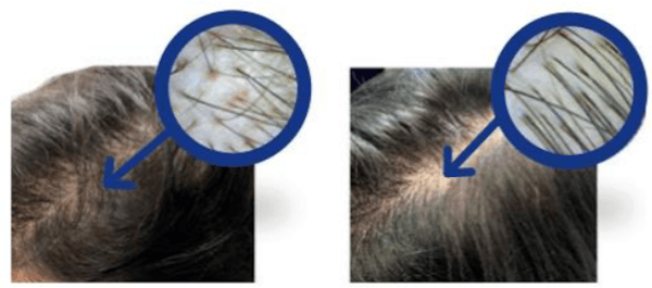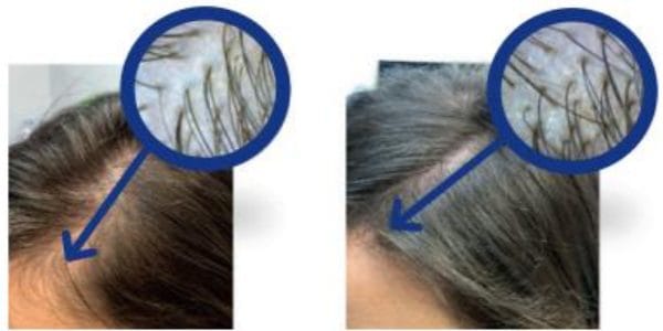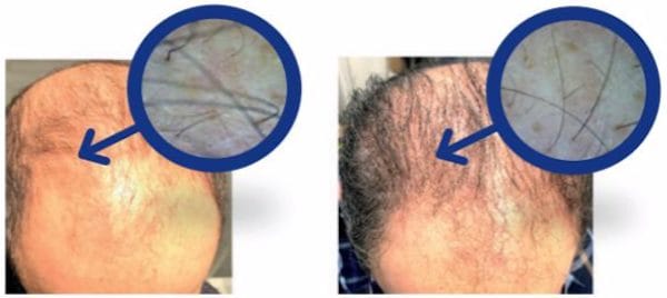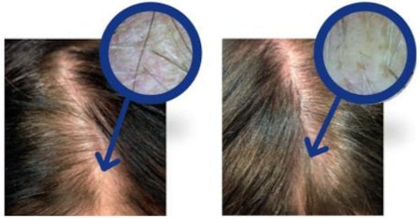 ![]() 1回目のINDIBA前、毛髪は細く頭頂部と前頭部にはほとんど毛髪が見られない。 3ヶ月の治療後、目に見えて毛髪が濃くなり同じ部位で新しい毛髪の成長が見られる。 | ![]() 1回目のINDIBA前、前頭部の毛細血管密度が低く、絶対数が少ないことが観察される。 3ヶ月の治療後、上部に新しい毛髪が現れ、目に見えて強く密になっている。 |